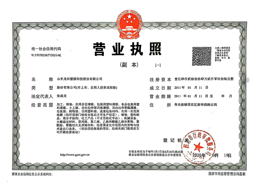 山東龍興塑膜科技股份有限公司前身為山東壽光龍興農(nóng)膜有限公司組建于2011年,2018年10月重組,目前是壽光市國(guó)有控股公司、高新技術(shù)企業(yè),是專業(yè)生產(chǎn)高檔農(nóng)用薄膜、工業(yè)用薄膜的企業(yè),是一家以產(chǎn)品制造為主,集科研開發(fā)、產(chǎn)品設(shè)計(jì)、技術(shù)服務(wù)于一體的綜合性企業(yè)。公司現(xiàn)有職工228人,各類工程技術(shù)人員97人,管理人員20余人,注冊(cè)資金14234.2096萬元,總資產(chǎn)102314萬元,目前是壽光市國(guó)有控股公司、高新技術(shù)企業(yè)。公司是中國(guó)塑料加工工業(yè)協(xié)會(huì)農(nóng)膜專業(yè)委員會(huì)會(huì)員單位,中國(guó)復(fù)合材料工業(yè)協(xié)會(huì)會(huì)員單位,中國(guó)塑料加工工業(yè)協(xié)會(huì)雙向拉伸聚酯薄膜專業(yè)委員會(huì)會(huì)員單位...